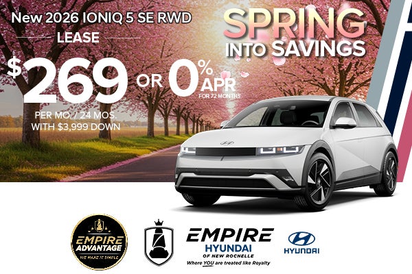 * For well qualified lessees approved by Hyundai Motor Finance, closed-end lease for a 2026 IONIQ 5 RWD SE(51412REZ) is $269 per month for 24 months with $3,999 due at lease signing (excludes registration, tax, title, license, processing or documentation fees, insurance and any emission charge). Available from April 1, 2026 through April 30, 2026. Not all lessees will qualify. Higher lease rates apply for lessees with lower credit ratings. Offer shown based on $3,999 due at lease signing (includes $269 first payment and $3,730 capitalized cost reduction). No security deposit required. For well-qualified buyers on approved credit through Hyundai Motor Finance on new 2026 IONIQ 5 SE STANDARD RANGE. At 0.00% Annual Percentage Rate (APR), payment for 72 months is $13.89 per month per $1,000 financed. No down payment required, other than any bonus cash requirements. Not all customers will qualify.