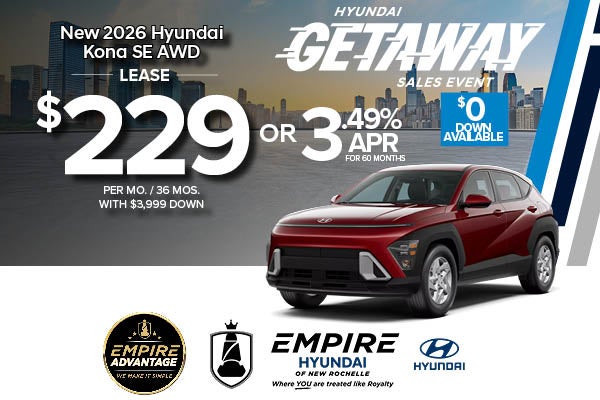 * For well qualified lessees approved by Hyundai Motor Finance, closed-end lease for a 2026 KONA SE AWD(Q1402A45) is $229 per month for 36 months with $3,999 due at lease signing (excludes registration, tax, title, license, processing or documentation fees, insurance and any emission charge). Available from March 3, 2026 through March 31, 2026. Not all lessees will qualify. Higher lease rates apply for lessees with lower credit ratings. Offer shown based on $3,999 due at lease signing (includes $229 first payment and $3,770 capitalized cost reduction). No security deposit required. For well-qualified buyers on approved credit through Hyundai Motor Finance on new 2026 KONA SE AWD. At 3.49% Annual Percentage Rate (APR), payment for 60 months is $18.19 per month per $1,000 financed. No down payment required, other than any bonus cash requirements. Not all customers will qualify.