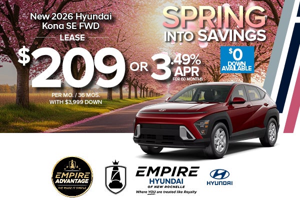 * For well qualified lessees approved by Hyundai Motor Finance, closed-end lease for a 2026 KONA SE FWD(Q1402F45) is $209 per month for 36 months with $3,999 due at lease signing (excludes registration, tax, title, license, processing or documentation fees, insurance and any emission charge). Available from April 1, 2026 through April 30, 2026. Not all lessees will qualify. Higher lease rates apply for lessees with lower credit ratings. Offer shown based on $3,999 due at lease signing (includes $209 first payment and $3,790 capitalized cost reduction). No security deposit required.For well-qualified buyers on approved credit through Hyundai Motor Finance on new 2026 KONA SE AWD. At 3.49% Annual Percentage Rate (APR), payment for 60 months is $18.19 per month per $1,000 financed. No down payment required, other than any bonus cash requirements. Not all customers will qualify.