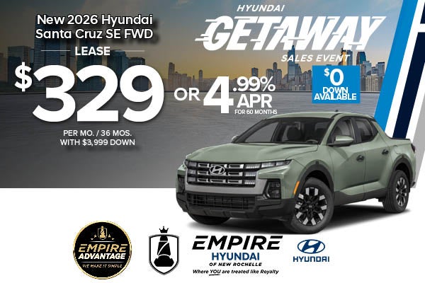 * For well qualified lessees approved by Hyundai Motor Finance, closed-end lease for a 2026 SANTA CRUZ SE FWD(90402F45) is $329 per month for 36 months with $3,999 due at lease signing (excludes registration, tax, title, license, processing or documentation fees, insurance and any emission charge). Available from March 3, 2026 through March 31, 2026. Not all lessees will qualify. Higher lease rates apply for lessees with lower credit ratings. Offer shown based on $3,999 due at lease signing (includes $329 first payment and $3,670 capitalized cost reduction). No security deposit required. For well-qualified buyers on approved credit through Hyundai Motor Finance on new 2026 SANTA CRUZ SE FWD. At 4.99% Annual Percentage Rate (APR), payment for 60 months is $18.87 per month per $1,000 financed. No down payment required, other than any bonus cash requirements. Not all customers will qualify.