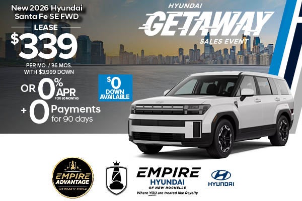 * For well qualified lessees approved by Hyundai Motor Finance, closed-end lease for a 2026 SANTA FE SE 2.5T FWD(65402FT5) is $339 per month for 36 months with $3,999 due at lease signing (excludes registration, tax, title, license, processing or documentation fees, insurance and any emission charge). Available from March 3, 2026 through March 31, 2026. Not all lessees will qualify. Higher lease rates apply for lessees with lower credit ratings. Offer shown based on $3,999 due at lease signing (includes $339 first payment and $3,660 capitalized cost reduction). No security deposit required. At 0.00% Annual Percentage Rate (APR), payment for 60 months is $16.67 per month per $1,000 financed. No down payment required, other than any bonus cash requirements. Not all customers will qualify. Higher finance rates apply for buyers approved for credit with lower credit ratings. Subject to standard Hyundai Motor Finance credit approval guidelines and policies. MSRP of $35,050 for includes destination; excludes tax, license, title, registration, processing or documentation fees, insurance and any emission charge. If a qualified buyer defers payments for 90 days, the first scheduled monthly payment will be due 90 days from contract execution.